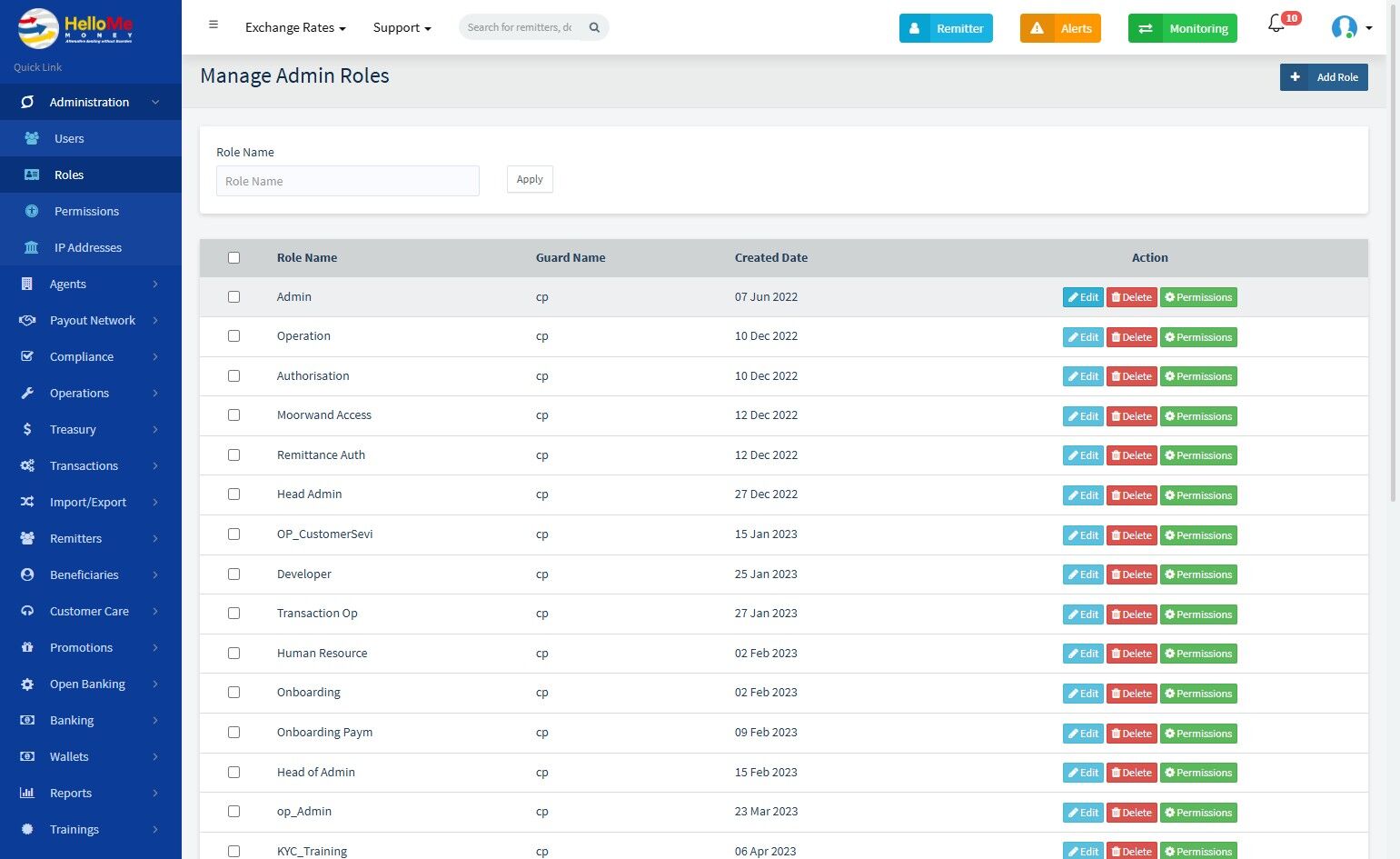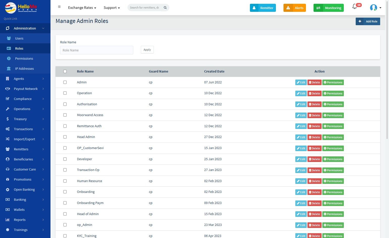 The Admin Roles section allows admins to create and manage predefined roles that group permissions for consistent access control. Roles can be searched by name, viewed in a table, and edited or deleted. Clicking Add Role opens a form to define a new role, where a unique, descriptive name must be provided.