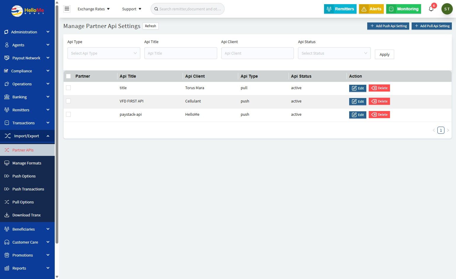 Facilitates the integration of external payout and pay-in partners through API connections. This module enables the platform to either send (push) or receive (pull) transaction data from third-party systems β automating transaction flows and ensuring real-time synchronization with partners.