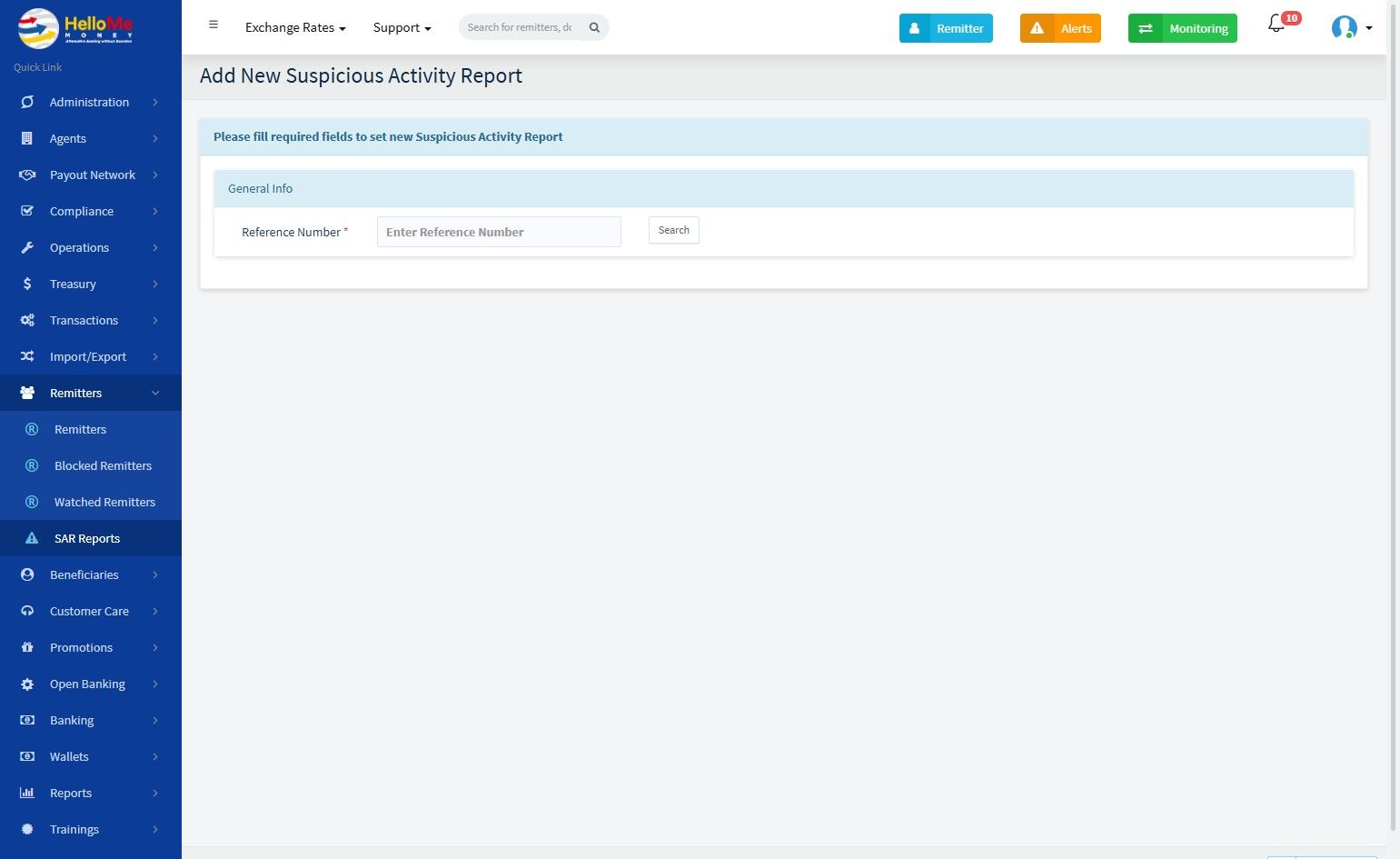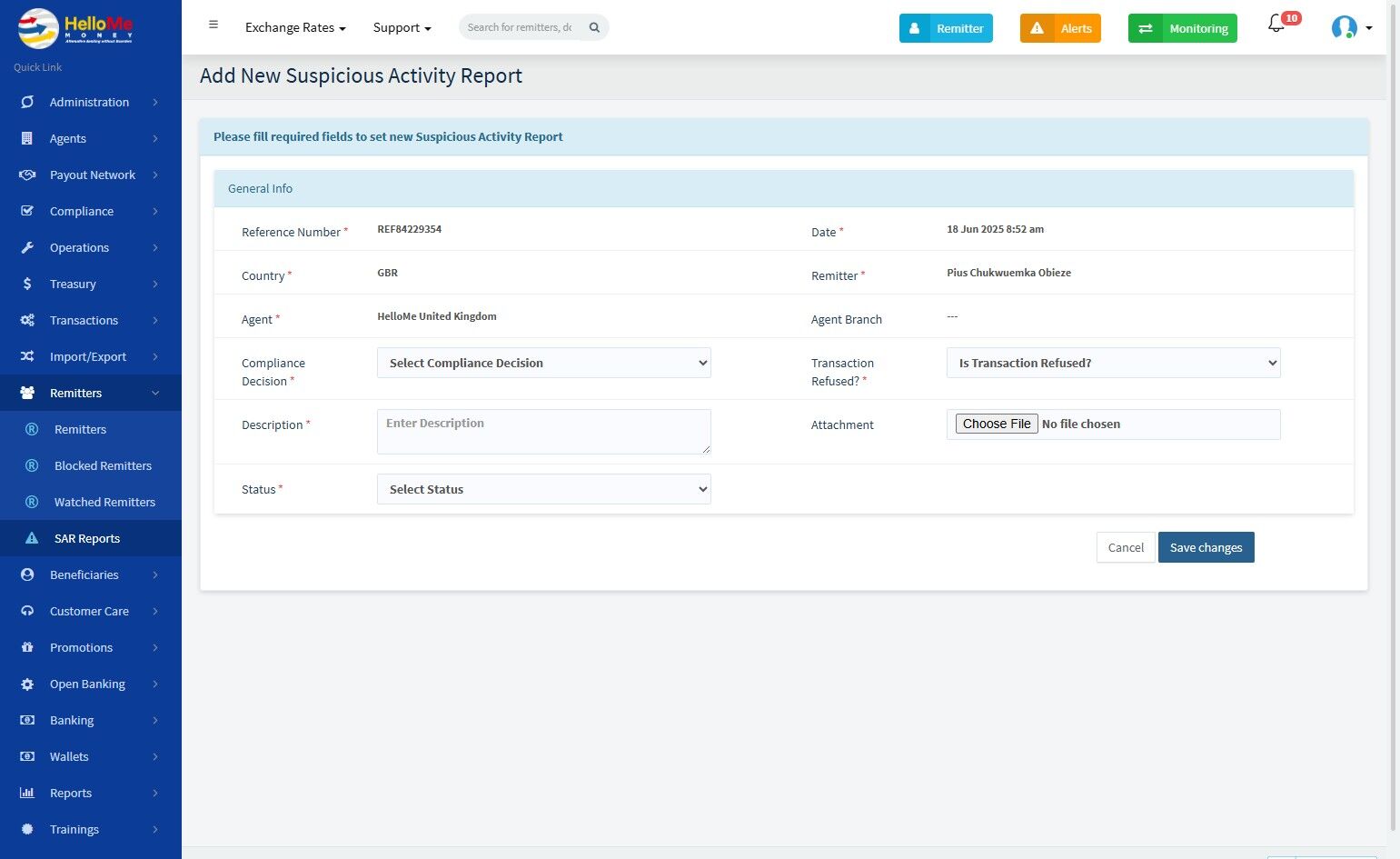 The SAR Reports sub-module is not just a compliance tool; it is a strategic safeguard for HelloMe Moneyβs operations, ensuring regulatory alignment while maintaining customer trust across global remittance operations.