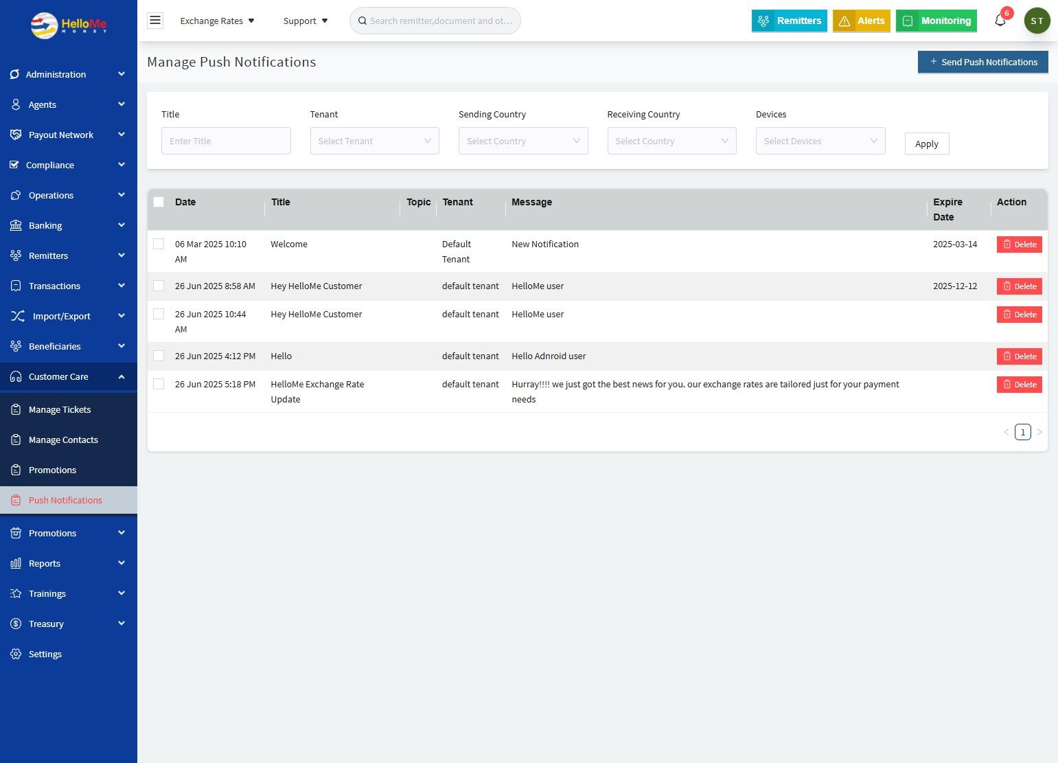 The Push Notifications sub-module allows HelloMe Money administrators to send real-time alerts or promotional messages directly to usersβ on mobile and web applications across different regions, tenants, and platforms.