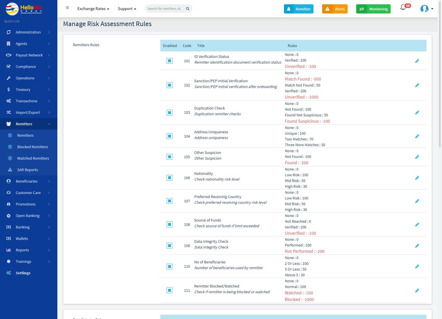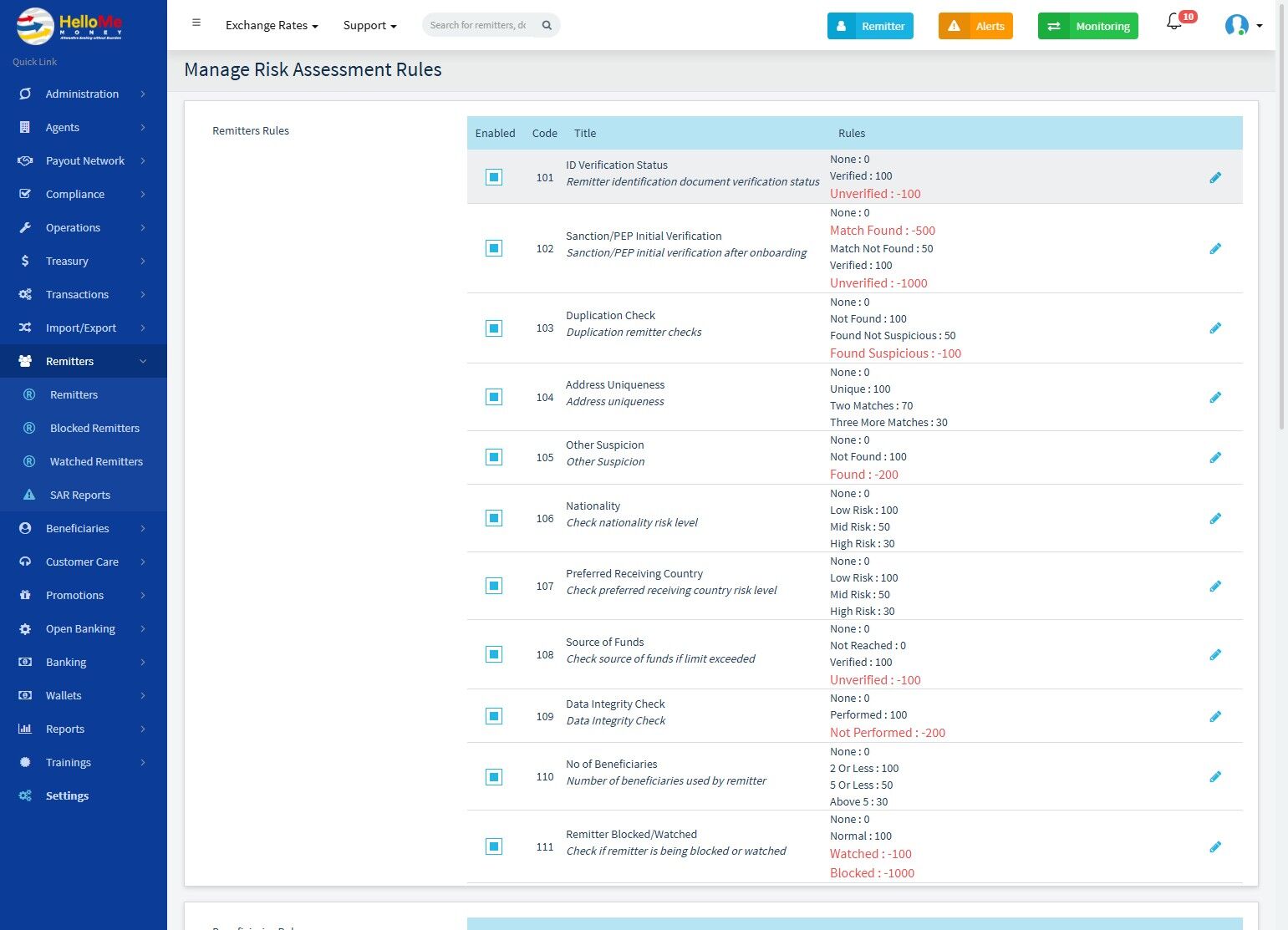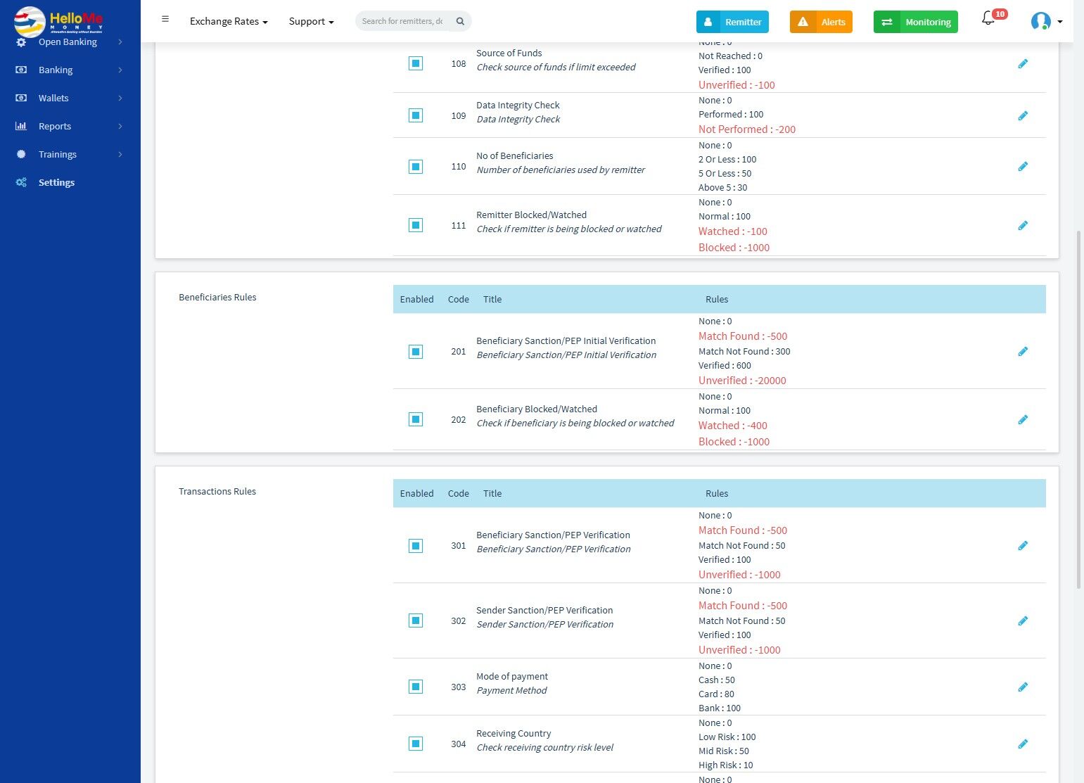 Each rule contributes positively or negatively to a risk score, making this module essential to AML (AntiMoney Laundering) and fraud prevention operations.